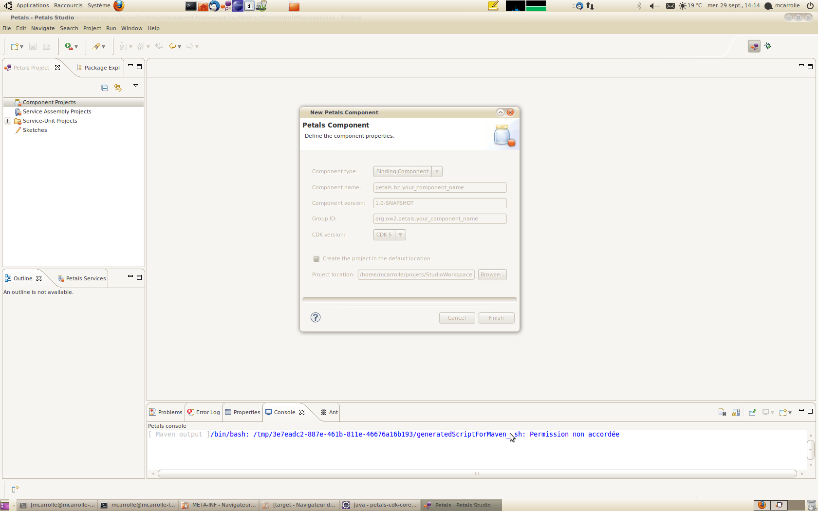 When I click "finish" on the wizard for creating component project, the studio freeze and an error is logged(see screenshot attachment). Folder right : drwxr-xr-x 2 mcarrolle mcarrolle 4096 2010-07-03 22:15 about_files rw-rr- 1 mcarrolle mcarrolle 577 2010-02-10 08:26 about.html rw-rr- 1 mcarrolle mcarrolle 114687 2010-07-03 22:15 artifacts.xml drwxr-xr-x 9 mcarrolle mcarrolle 4096 2010-07-09 16:09 configuration drwxr-xr-x 16 mcarrolle mcarrolle 4096 2010-07-03 22:14 features rw-rr- 1 mcarrolle mcarrolle 13536 2010-07-03 22:12 icon.xpm rw-rr- 1 mcarrolle mcarrolle 266168 2010-02-10 08:26 libcairo-swt.so rw-rr- 1 mcarrolle mcarrolle 4257 2010-04-15 11:54 License_PetalsStudio.txt drwxr-xr-x 5 mcarrolle mcarrolle 4096 2010-07-09 16:11 p2 -rwxr-xr-x 1 mcarrolle mcarrolle 52932 2010-02-10 08:26 PetalsStudio rw-rr- 1 mcarrolle mcarrolle 225 2010-07-03 22:15 PetalsStudio.ini drwxr-xr-x 15 mcarrolle mcarrolle 36864 2010-07-03 22:14 plugins