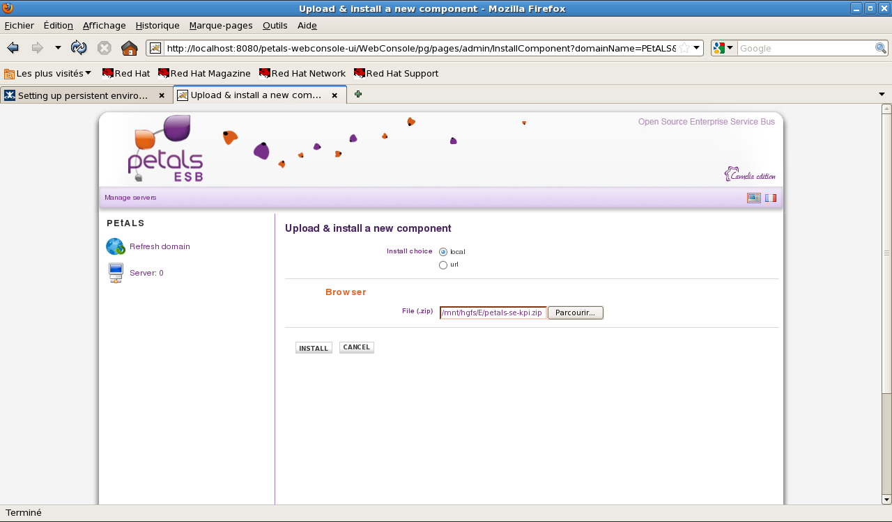 When I try to install a local component, I've got an error (see the stack trace further). The installation is ok with the autoloader and the ant tasks. I put in attachment the se-kpi.zip used, and a screenshot. The stack trace: java.lang.NoSuchMethodError: javax.servlet.ServletContext.getContextPath()Ljava/lang/String; org.ow2.petals.tools.webconsole.util.GeneralHelper.getFileRepositoryURL(GeneralHelper.java:636) org.ow2.petals.tools.webconsole.business.InstallComponentBBean.beginLocalInstallation(InstallComponentBBean.java:162) org.ow2.petals.tools.webconsole.uibeans.InstallComponentUIBean.install(InstallComponentUIBean.java:196) sun.reflect.NativeMethodAccessorImpl.invoke0(Native Method) sun.reflect.NativeMethodAccessorImpl.invoke(NativeMethodAccessorImpl.java:39) sun.reflect.DelegatingMethodAccessorImpl.invoke(DelegatingMethodAccessorImpl.java:25) java.lang.reflect.Method.invoke(Method.java:597) org.ow2.opensuit.cel.impl.tree.impl.ast.AstInvocation.invoke(AstInvocation.java:146) org.ow2.opensuit.cel.impl.tree.impl.ast.AstMethod.invoke(AstMethod.java:136) org.ow2.opensuit.cel.impl.tree.impl.ast.AstEval.invoke(AstEval.java:59) org.ow2.opensuit.core.expression.ExpressionUtils.invokeExpression(ExpressionUtils.java:119) org.ow2.opensuit.xml.base.binding.Expression.invoke(Expression.java:147) org.ow2.opensuit.xml.base.action.DoAndForward.invoke(DoAndForward.java:141) org.ow2.opensuit.xml.base.html.form.EditForm.submit(EditForm.java:152) sun.reflect.NativeMethodAccessorImpl.invoke0(Native Method) sun.reflect.NativeMethodAccessorImpl.invoke(NativeMethodAccessorImpl.java:39) sun.reflect.DelegatingMethodAccessorImpl.invoke(DelegatingMethodAccessorImpl.java:25) java.lang.reflect.Method.invoke(Method.java:597) org.ow2.opensuit.xml.base.Application.service(Application.java:514) org.ow2.opensuit.core.impl.j2ee.OpenSuitServlet.service(OpenSuitServlet.java:155) javax.servlet.http.HttpServlet.service(HttpServlet.java:729) org.apache.catalina.core.ApplicationFilterChain.internalDoFilter(ApplicationFilterChain.java:269) org.apache.catalina.core.ApplicationFilterChain.doFilter(ApplicationFilterChain.java:188) org.apache.catalina.core.StandardWrapperValve.invoke(StandardWrapperValve.java:213) org.apache.catalina.core.StandardContextValve.invoke(StandardContextValve.java:172) org.apache.catalina.core.StandardHostValve.invoke(StandardHostValve.java:127) org.apache.catalina.valves.ErrorReportValve.invoke(ErrorReportValve.java:117) org.apache.catalina.core.StandardEngineValve.invoke(StandardEngineValve.java:108) org.apache.catalina.connector.CoyoteAdapter.service(CoyoteAdapter.java:174) org.apache.coyote.http11.Http11Processor.process(Http11Processor.java:873) org.apache.coyote.http11.Http11BaseProtocol$Http11ConnectionHandler.processConnection(Http11BaseProtocol.java:665) org.apache.tomcat.util.net.PoolTcpEndpoint.processSocket(PoolTcpEndpoint.java:528) org.apache.tomcat.util.net.LeaderFollowerWorkerThread.runIt(LeaderFollowerWorkerThread.java:81) org.apache.tomcat.util.threads.ThreadPool$ControlRunnable.run(ThreadPool.java:689) java.lang.Thread.run(Thread.java:619)