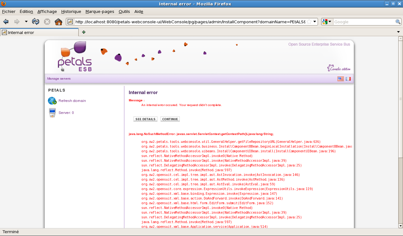 When I want to install a component (put into attachment) through a "local installation", it failes. it's ok through ant tasks and the autoloader. The stack trace is: java.lang.NoSuchMethodError: javax.servlet.ServletContext.getContextPath()Ljava/lang/String; org.ow2.petals.tools.webconsole.util.GeneralHelper.getFileRepositoryURL(GeneralHelper.java:636) org.ow2.petals.tools.webconsole.business.InstallComponentBBean.beginLocalInstallation(InstallComponentBBean.java:162) org.ow2.petals.tools.webconsole.uibeans.InstallComponentUIBean.install(InstallComponentUIBean.java:196) sun.reflect.NativeMethodAccessorImpl.invoke0(Native Method) sun.reflect.NativeMethodAccessorImpl.invoke(NativeMethodAccessorImpl.java:39) sun.reflect.DelegatingMethodAccessorImpl.invoke(DelegatingMethodAccessorImpl.java:25) java.lang.reflect.Method.invoke(Method.java:597) org.ow2.opensuit.cel.impl.tree.impl.ast.AstInvocation.invoke(AstInvocation.java:146) org.ow2.opensuit.cel.impl.tree.impl.ast.AstMethod.invoke(AstMethod.java:136) org.ow2.opensuit.cel.impl.tree.impl.ast.AstEval.invoke(AstEval.java:59) org.ow2.opensuit.core.expression.ExpressionUtils.invokeExpression(ExpressionUtils.java:119) org.ow2.opensuit.xml.base.binding.Expression.invoke(Expression.java:147) org.ow2.opensuit.xml.base.action.DoAndForward.invoke(DoAndForward.java:141) org.ow2.opensuit.xml.base.html.form.EditForm.submit(EditForm.java:152) sun.reflect.NativeMethodAccessorImpl.invoke0(Native Method) sun.reflect.NativeMethodAccessorImpl.invoke(NativeMethodAccessorImpl.java:39) sun.reflect.DelegatingMethodAccessorImpl.invoke(DelegatingMethodAccessorImpl.java:25) java.lang.reflect.Method.invoke(Method.java:597) org.ow2.opensuit.xml.base.Application.service(Application.java:514) org.ow2.opensuit.core.impl.j2ee.OpenSuitServlet.service(OpenSuitServlet.java:155) javax.servlet.http.HttpServlet.service(HttpServlet.java:729) org.apache.catalina.core.ApplicationFilterChain.internalDoFilter(ApplicationFilterChain.java:269) org.apache.catalina.core.ApplicationFilterChain.doFilter(ApplicationFilterChain.java:188) org.apache.catalina.core.StandardWrapperValve.invoke(StandardWrapperValve.java:213) org.apache.catalina.core.StandardContextValve.invoke(StandardContextValve.java:172) org.apache.catalina.core.StandardHostValve.invoke(StandardHostValve.java:127) org.apache.catalina.valves.ErrorReportValve.invoke(ErrorReportValve.java:117) org.apache.catalina.core.StandardEngineValve.invoke(StandardEngineValve.java:108) org.apache.catalina.connector.CoyoteAdapter.service(CoyoteAdapter.java:174) org.apache.coyote.http11.Http11Processor.process(Http11Processor.java:873) org.apache.coyote.http11.Http11BaseProtocol$Http11ConnectionHandler.processConnection(Http11BaseProtocol.java:665) org.apache.tomcat.util.net.PoolTcpEndpoint.processSocket(PoolTcpEndpoint.java:528) org.apache.tomcat.util.net.LeaderFollowerWorkerThread.runIt(LeaderFollowerWorkerThread.java:81) org.apache.tomcat.util.threads.ThreadPool$ControlRunnable.run(ThreadPool.java:689) java.lang.Thread.run(Thread.java:619) There is no more trace into the petals esb or tomcat logs .